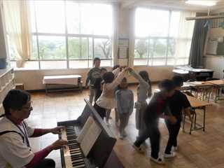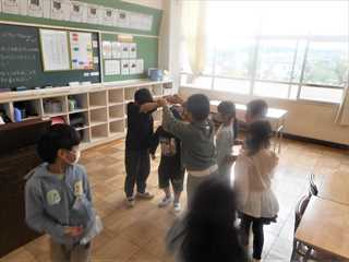 2年生の音楽では、♪ロンドン橋の歌を歌いながら、楽しんでいました。途中で「校長先生もいっしょにやろう!」と子供たちから誘われて、一緒に楽しみました。