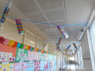 1年生の教室前のろうかには、子供たちが色をぬった思い思いのこいのぼりが飾られています。
