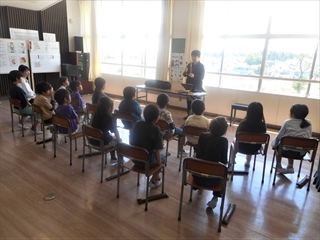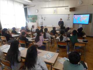 4年生の外国語活動の授業では、支援員の自己紹介の中で、出身国の食べ物や好きなアニメの話など、子供たちは興味深く聞いていました。