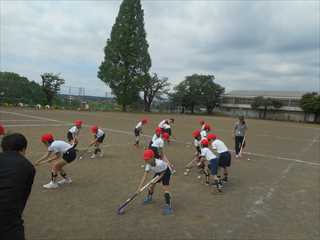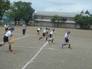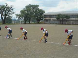 3年生は初めてのホッケー体験。長いスティックをもって、ボールを左右に動かす練習から始まりました。