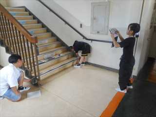 5年生が算数の学習で、身近なところにある比例の関係を探していました。このグループは、階段の段数と階段の高さに比例の関係があるのではないかと考え調査していました。