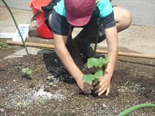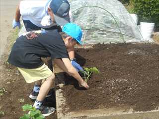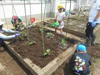 あけぼの学級の子供たちが、きゅうりやトマトの苗植えをしました。支柱を立て紐で結び付けたり、たっぷりの水を与えたりしていました。収穫が楽しみです。