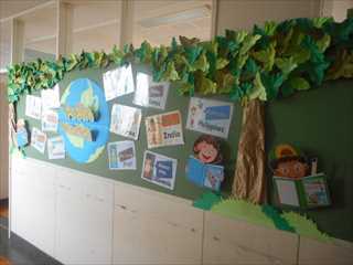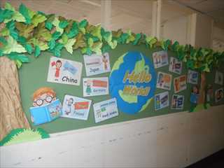 5・6年生の外国語、3・4年生の外国語活動を行っている教室前のろうか掲示を紹介します。