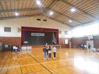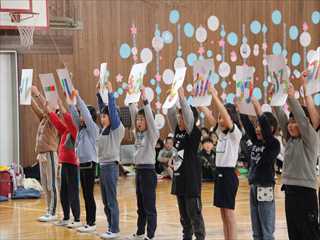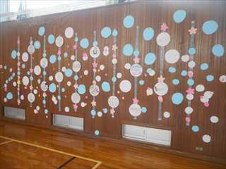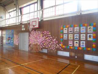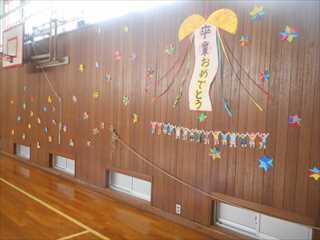 明日は、6年生を送る会です。会場の体育館は、1年生から5年生がそれぞれ準備した飾りが、きれいに飾られました。