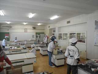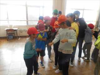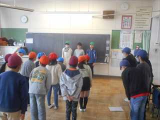 昼休みの時間に大きな地震が発生。職員室からの出火、校庭への避難です。