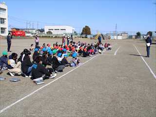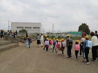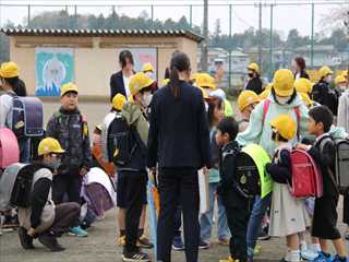 火災発生の放送が流れると、それぞれの場所から校庭へ避難。