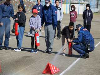 消防署の隊員の方からのお話の後、水消火器の体験とクラスごとに消防車での記念撮影をしました。