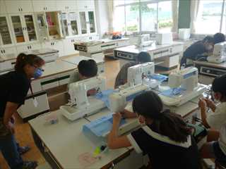 5年生は、家庭科ではじめてのミシンに挑戦しました。ボビンの糸巻きの仕方や、ミシンの糸掛けの仕方を練習しました。