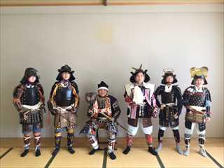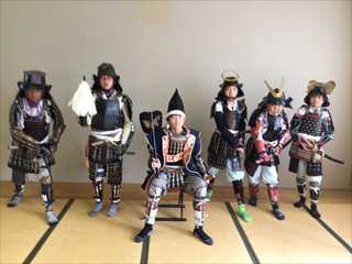 鎧を身にまとった凛々しい姿に変身した6年生。戦国時代の様子を体験できました。