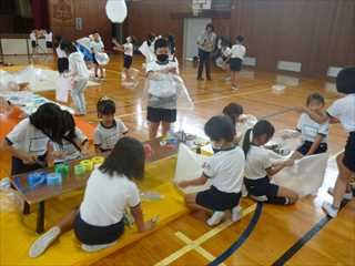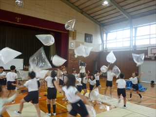 3年生の図工は、体育館でダイナミックに活動しました。
