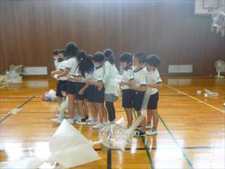 空気を入れたビニル袋を使って、思い思いに造形遊びを楽しみました。