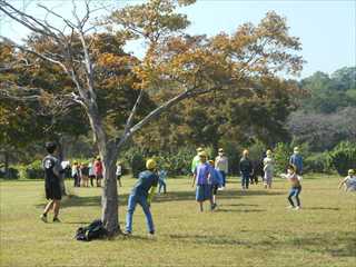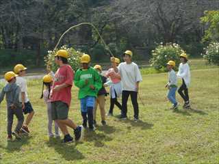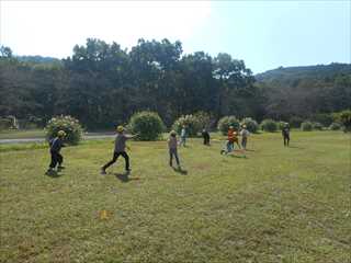 巾着田では、グループごとに高学年のリーダーを中心に、ドッチビーや”だるまさんが転んだ”など、楽しく活動できました。