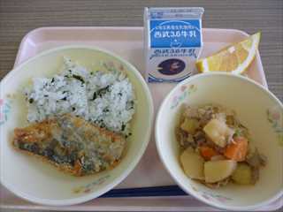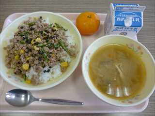 今日の給食には、『ほたるごはん』というメニューがありました。飯能市はほたるが見られる豊かな自然があります。暗い夜(そぼろ・のり)の水辺の草(いんげん)に止まり体を光らせるほたる(コーン)をイメージした飯能市オリジナルメニューです。