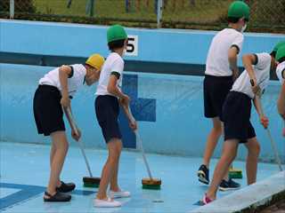 4年生、5年生、6年生が協力して、プールを掃除してくれました。プールサイドやトイレ、更衣室等も時間いっぱいきれいにしてくれました。
