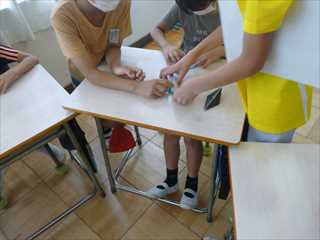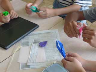 今日は、たてわり活動で教え合いながら、一人1羽ずつ折り鶴を折りました。