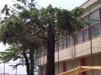 精明小学校には、児童の成長を見守ってくれている大きな木がたくさんあります。教頭先生と事務さんが一本一本確認してくれました。