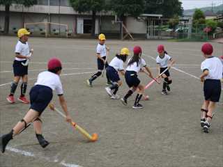 3年生にとってははじめてのホッケー教室。スティックを使って、ボールを操る楽しさを体験できました。