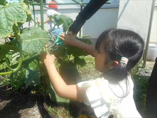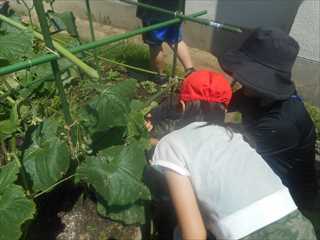 教室前の花壇で育てているきゅうりが、すくすくと生長しています。