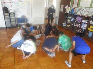 教室にバリケードをつくったり、放送を聴いて避難したりする訓練を行いました。