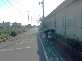 日傘を差したり、登校途中で水分補給したりしながら登校しています。