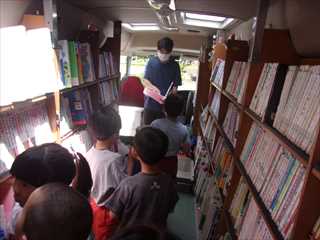 飯能市立図書館のみどり号が来校し、1年生が初めて本を借りました。