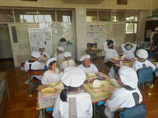 それぞれの教室で準備した給食を、縦割り班の教室に運んで、異学年で給食を通して交流をしました。