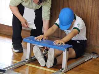 校庭では50m走、ボール投げ。体育館では、立ち幅跳び、上体起こし、反復横跳び、長座体前屈を行いました。