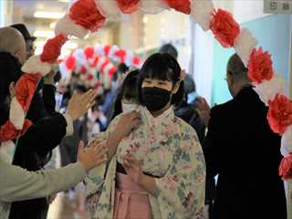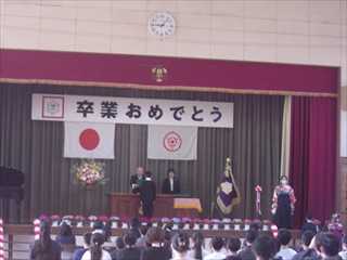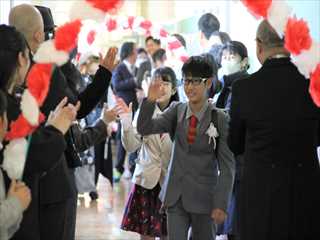 4年生、5年生が進行をつとめ、喜びの拍手に包まれて、卒業生が花のアーチをくぐりました。