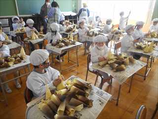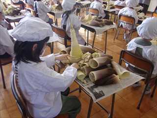 2年生が、明日の給食の準備として、たけのこの皮むき作業をしてくれました。