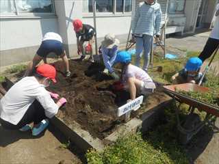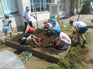 そして、きゅうりとなすの苗を一人一本ずつ植えました。