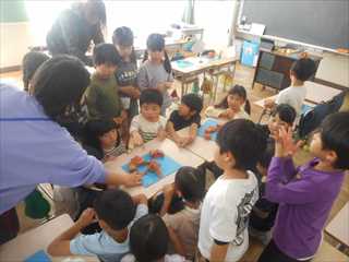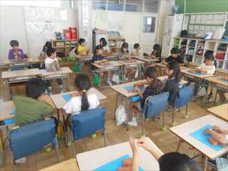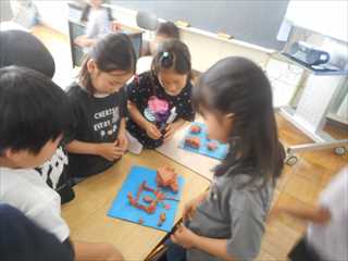 ねんどを使った造形遊びに夢中になって取り組んでいました。ねんどは、丸めたり伸ばしたり、形も作り変えることができるよさがあります。子供たちは思い思いに作品作りを楽しんでいました。途中でお互いの作品を見合い、よさを見つけ合って自分の作品作りに生かしていました。聴き合い、学び合いながら次々に湧き出てくる自分の発想を形に表そうとする子供たちの表情は、輝いていました。