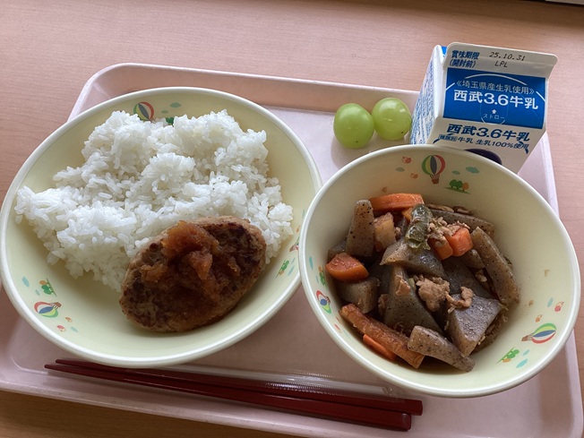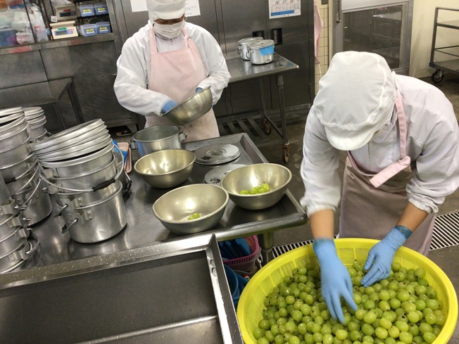 ・シャインマスカットは、一粒一粒鋏で切ったあと、3回洗ってからクラスの人数で食缶に入れていきます。旬の果物を味わって食べましょう。